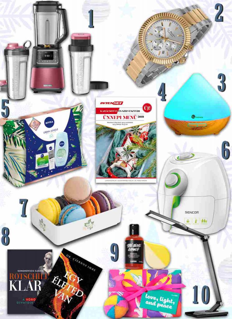 Ha az ajándékozandó fél imád főzni és sok időt tölt a konyhában, akkor jó ötlet lehet egy konyhai gép, mint például ez a Sencor vákumos automata turmixgép (1), amivel hétféle műveletet tudunk elvégezni , legyan az turmixolás, smoothie készítés, jégzúzás vagy épp diófélék és lisztek őrlése. Még mindig a konyhai vonalnál maradva egy forrólevegős fritőz is (6) ötletes ajándék, hiszen a megszokott rántott hús és sült krumpli kombót zsíradék hozzáadása nélkül elkészíthetjük vele, így egészségesebb lesz az étel. Apropó egészség: ha a kiszemelt hölgy épp életmódváltásba kezdett, akkor kedves ajándék lehet az Intenset legújabb karácsonyi és szilveszteri étrendje, ami olyan íncsiklandóan finom ünnepi étrendeket tartalmaz, amik nem növelik meg a mérleg fokát és egészségesek.