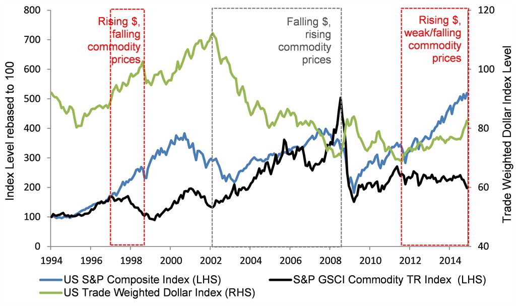 A dollár felértékelődése az USA-ban végbement folyamatos strukturális fejlesztések eredménye. Bár ezek nem most kezdődtek, de közben megváltozott a pénzügypolitikai háttér. A laza pénzügypolitika egészen a közelmúltig lényegében fedő alatt tartotta a dollár felértékelődését. Azonban a 2015-ös kamatláb-emelkedések kilátásának hatására, mely egybeesik az Európában és Japánban végrehajtandó további mennyiségi lazítással, ez a fedő felemelkedett. Előfordulhat, hogy a dollár árfolyama tartósan és jelentős mértékben fog nőni, amihez alacsonyabb nyersanyag-árak társulnak majd. Ez a kombináció hagyományosan kedvezni szokott az USA részvényeinek.