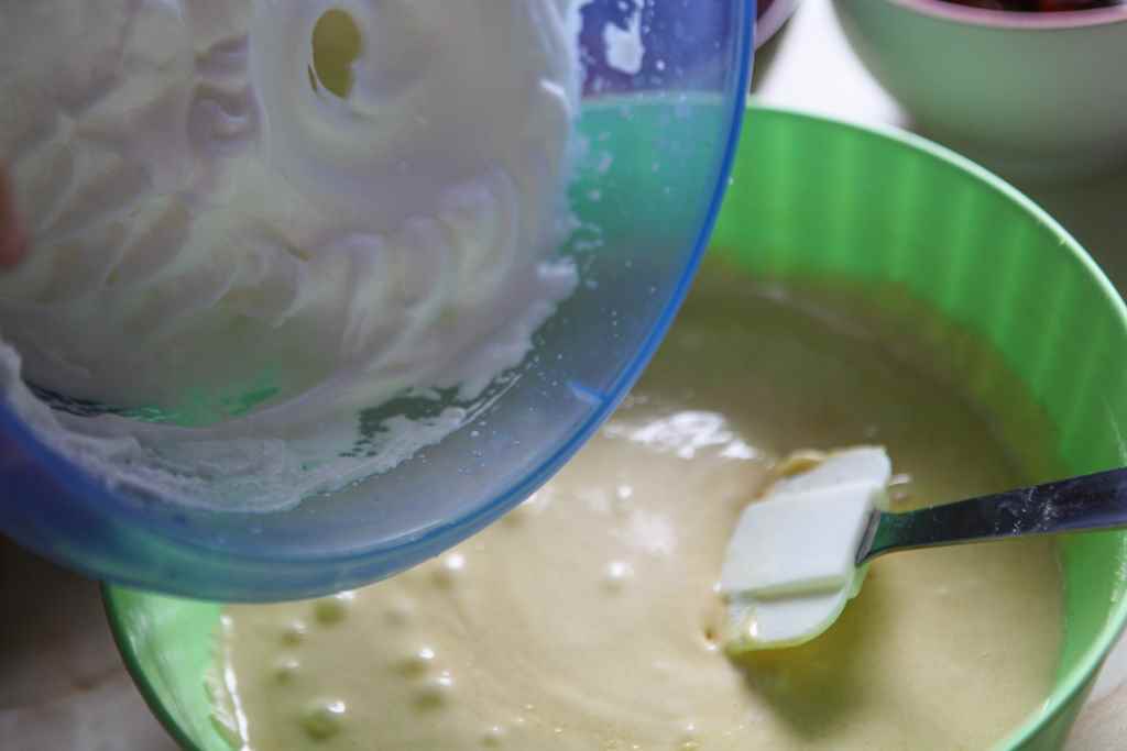 - Majd adjuk hozzá a felvert tojáshabot és óvatosan forgassuk bele a masszába