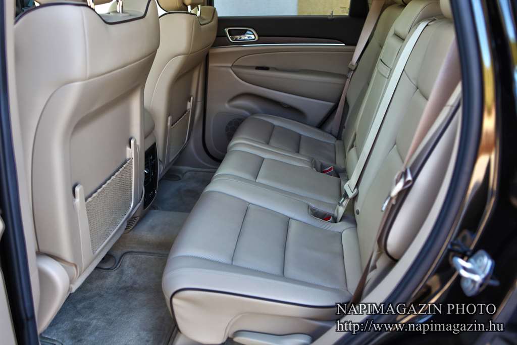 Kényelem tekintetében nincs hiány, ha elemezzük a Jeep Grand Cherokee Overland felszereltségű alternatíváját. A Nepál bézs elnevezésű Nappa bőrkárpitozás magáért beszél, kiváló minőségű, viszont jelentősen hajlamos a szennyeződésre. Főként a lábtörlők, egy sárosabb offroad túra után bizony aktuálissá válik rögtön a tisztításuk. Az első vezető- és utasoldali fűthető, hűthető és szellőztethető ülések fotel jellegűek, az ülőlapok és hátlapok is megfelelő szélességűek, hosszúságúak. Jelenleg már nem érezhető a korábbi, jó 20 évvel ezelőtt még honos trend, miszerint az ülőalkalmatosságok rugós matracra emlékeztető puhaságukkal hosszabb távú utaztatás esetén garantálták a krónikus derék- és hátfájást – a fejlesztőmérnökök eltalálták a Jeep Grand Cherokee esetében azt az arany középutat, melynek folyományaképp tényleges komfortról szól a fáma e téren is. A középre hajtható könyöktámasz hosszában állítható, két utasnak is elegendő helyet garantál.