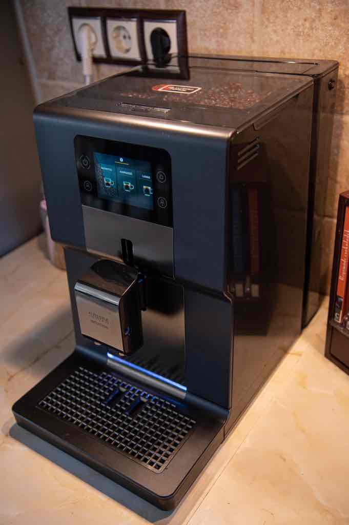 Hatalmas LCD kijelzőt kapunk a felső részen, a panel nem kapacitiív, viszont kitűnően reagál az irányításra, a felület stabil ujjmozduklatokat tesz lehetővé. A szemes kávékészítményt az arra speciálisan kialakított viszonylag nagy kapacitású tárolófakkba helyezhetjük, melyen belül az örlés erősségét is állíthatjuk több fokozatban. A fedél hatékony gumikávával tömít zárás után, enyhén bepattintható, így hermetikusan zárja a betöltött darálatlan kávémennyiséget – ügyelve arra, hogy az aroma ne illanjon el idő előtt.